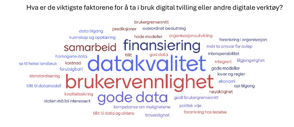 På spørsmål om hva som er de viktigste faktorene for å ta i bruk digitale verktøy, var datakvalitet, brukervennlighet, finansiering og samarbeid (se ordskyen) de viktigste fra flest deltakere.