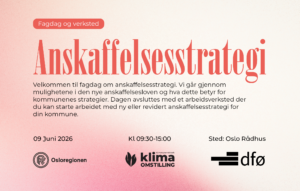 Osloregionen, DFØ og Kommunenettverk for klimaomstilling inviterer til workshop om anskaffelsesstrategi. Stortinget har vedtatt ny anskaffelseslov som trer i kraft 1. juli 2026. En av endringene er at det stilles krav om at alle kommuner skal ha anskaffelsesstrategi og tilhørende rutiner for iverksetting av strategien.
